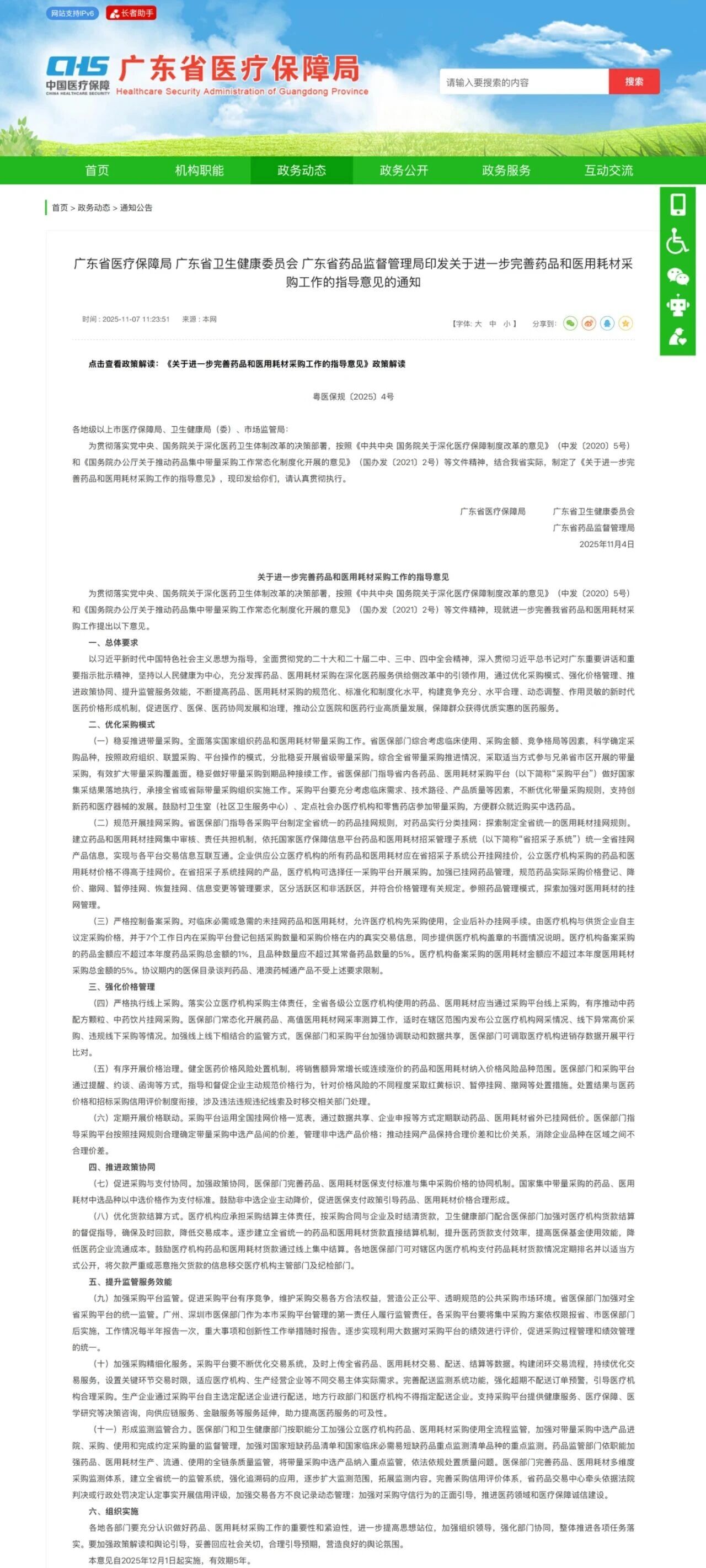 近日,廣東醫(yī)保局官網(wǎng)發(fā)布《關(guān)于進(jìn)一步完善藥品和醫(yī)用耗材采購(gòu)工作的指導(dǎo)意見(jiàn)的通知》(簡(jiǎn)稱《通知》,完整見(jiàn)文末),自2025年12月1日起實(shí)施,有效期5年。