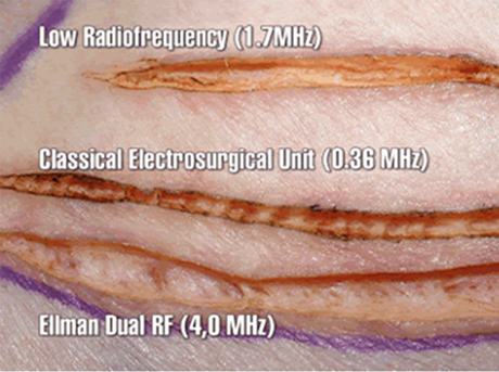 與傳統(tǒng)的"電刀"相比較,ellman?射頻技術(shù)僅產(chǎn)生他們1/3的側(cè)向熱損傷變形