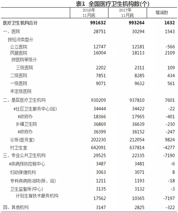 截至2017年11月底,全國(guó)醫(yī)療衛(wèi)生機(jī)構(gòu)數(shù)達(dá)99.3萬(wàn)個(gè)。與2016年11月底比較,全國(guó)醫(yī)療衛(wèi)生機(jī)構(gòu)增加1632個(gè),其中:醫(yī)院增加1543個(gè),基層醫(yī)療衛(wèi)生機(jī)構(gòu)增加7601個(gè),專(zhuān)業(yè)公共衛(wèi)生機(jī)構(gòu)減少7190個(gè)。