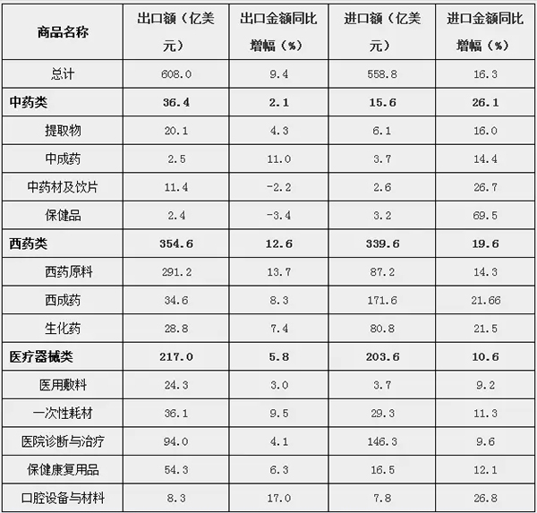 根據(jù)海關(guān)進(jìn)出口數(shù)據(jù),2017年我國(guó)醫(yī)藥產(chǎn)品完成進(jìn)出口貿(mào)易總額1166.8億美元,同比增長(zhǎng)12.6%;進(jìn)口額558.8億美元,同比增長(zhǎng)16.3%;出口額608.0億美元,同比增長(zhǎng)9.4%,增幅達(dá)到近五年的最高值。