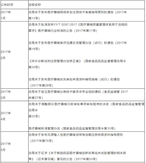 2017年是醫(yī)療器械法規(guī)快速更新的一年。在這一年中,國家食品藥品監(jiān)督管理局(CFDA)和醫(yī)療器械審評中心(CMDE)出臺了大批量的新法規(guī)及指導原則,覆蓋多個領域,包括加快審批、鼓勵醫(yī)療器械創(chuàng)新、完善注冊辦法、加強臨床試驗管理、提升技術能力等多方面。