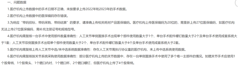 1月12日,四川省醫(yī)保局發(fā)布《川藥招〔2024〕9號(hào) 關(guān)于開展人工關(guān)節(jié)類醫(yī)用耗材整改情況“回頭看”工作醫(yī)療機(jī)構(gòu)問(wèn)題數(shù)據(jù)處理的通知》。其中指出,根據(jù)《關(guān)于開展人工關(guān)節(jié)類醫(yī)用耗材整改情況“回頭看”工作的通知》相關(guān)要求,國(guó)家聯(lián)采辦梳理了截至目前醫(yī)療機(jī)構(gòu)上傳數(shù)據(jù)中的問(wèn)題,請(qǐng)各單位督促醫(yī)療機(jī)構(gòu)及時(shí)修改問(wèn)題數(shù)據(jù)并重新上傳。