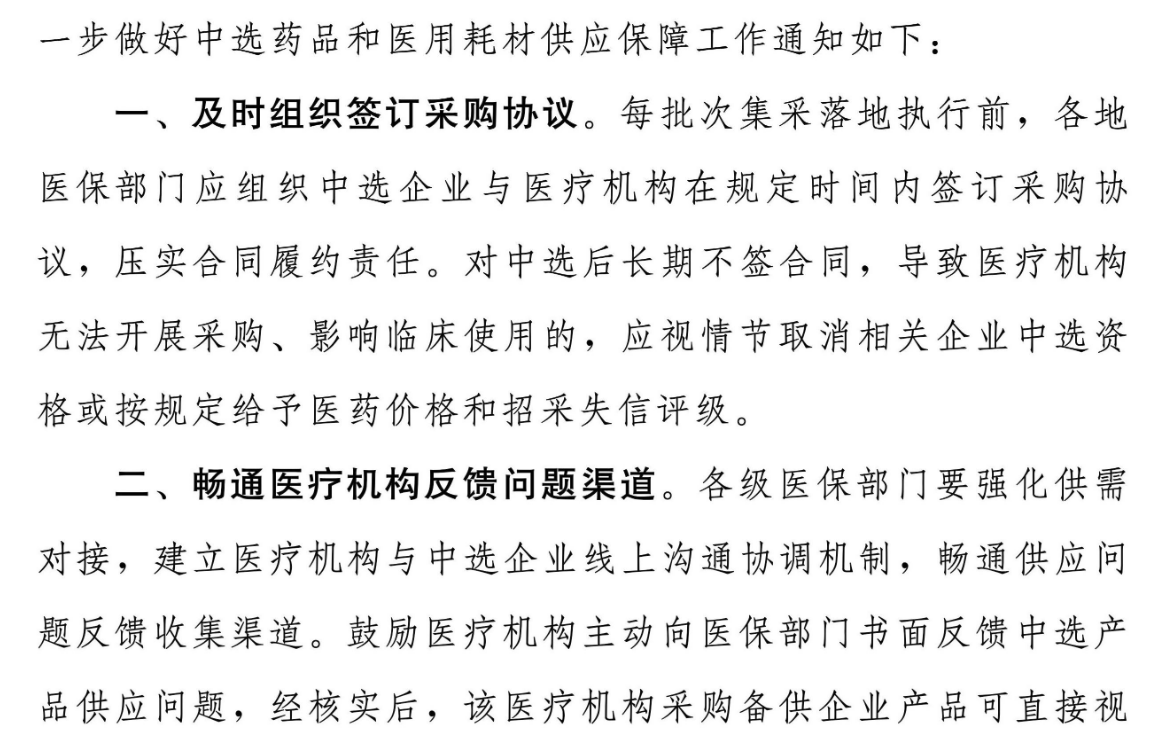 文件中提出及時(shí)組織簽訂采購(gòu)協(xié)議、暢通醫(yī)療機(jī)構(gòu)反饋問(wèn)題渠道、積極協(xié)調(diào)應(yīng)對(duì)短時(shí)間激增需求、做好中選產(chǎn)品供應(yīng)情況監(jiān)測(cè)、探索建立供應(yīng)情況評(píng)價(jià)機(jī)制、加強(qiáng)供應(yīng)情況評(píng)分結(jié)果運(yùn)用等六項(xiàng)舉措,加強(qiáng)集采中選產(chǎn)品供應(yīng)保障。