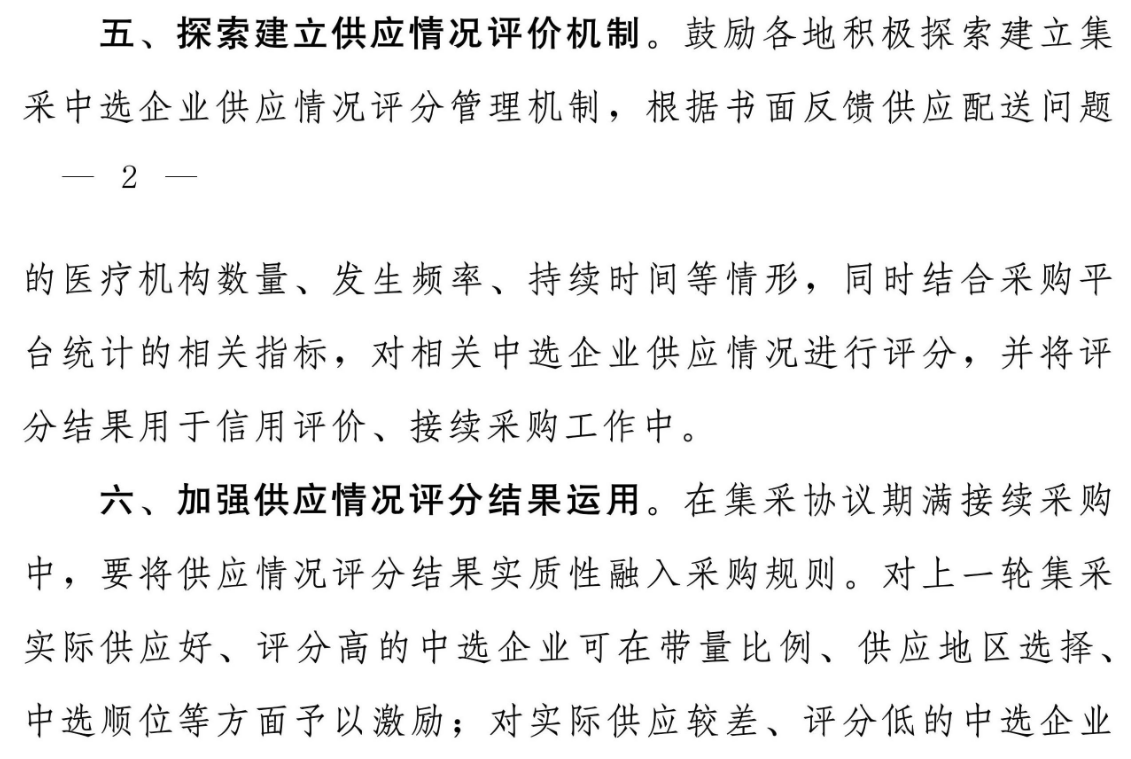 加強(qiáng)供應(yīng)情況評(píng)分結(jié)果運(yùn)用。在集采協(xié)議期滿接續(xù)采購(gòu)中,要將供應(yīng)情況評(píng)分結(jié)果實(shí)質(zhì)性融入采購(gòu)規(guī)則。對(duì)上一輪集采實(shí)際供應(yīng)好、評(píng)分高的中選企業(yè)可在帶量比例、供應(yīng)地區(qū)選擇中選順位等方面予以激勵(lì);對(duì)實(shí)際供應(yīng)較差、評(píng)分低的中選企業(yè)應(yīng)采取一定制約,直至取消其申報(bào)資格。