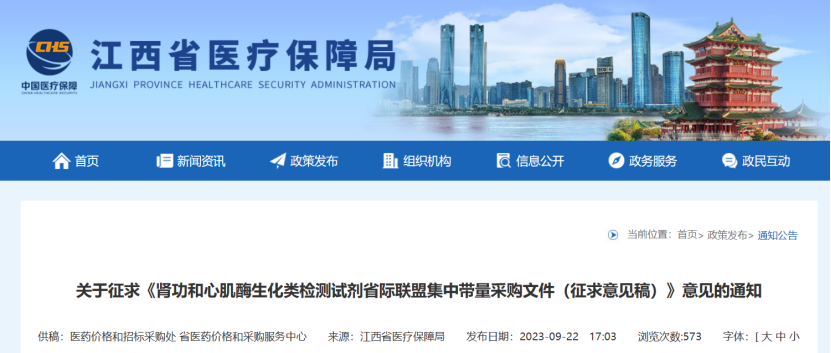 9月22日,江西省醫(yī)保局發(fā)布《關于征求<腎功和心肌酶生化類檢測試劑省際聯(lián)盟集中帶量采購文件(征求意見稿)>意見的通知》。