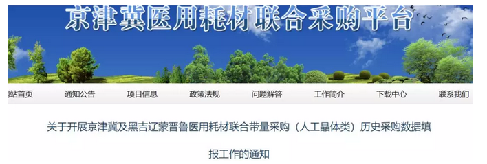 1月6日,京津冀醫(yī)用耗材聯(lián)合采購(gòu)平臺(tái)發(fā)布《關(guān)于開展京津冀及黑吉遼蒙晉魯醫(yī)用耗材聯(lián)合帶量采購(gòu)(人工晶體類)歷史采購(gòu)數(shù)據(jù)填報(bào)工作的通知》。