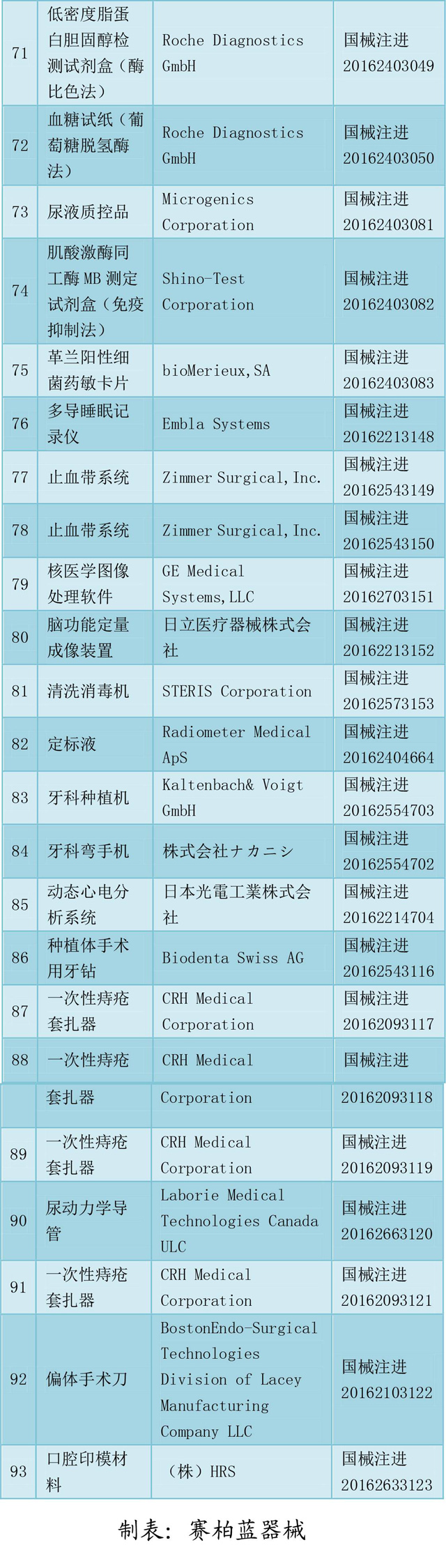 12月13日,CFDA發(fā)布了《總局關(guān)于批準注冊醫(yī)療器械產(chǎn)品公告(2016年第188號)》,公告稱,2016年11月,國家食品藥品監(jiān)督管理總局共批準注冊醫(yī)療器械產(chǎn)品93個。