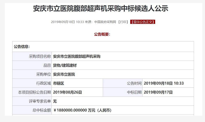 同是今天(9月18日),中國(guó)政府采購(gòu)網(wǎng)發(fā)布《安慶市立醫(yī)院腹部超聲機(jī)采購(gòu)中標(biāo)候選人公示》,顯示總中標(biāo)金額為188萬(wàn)元。