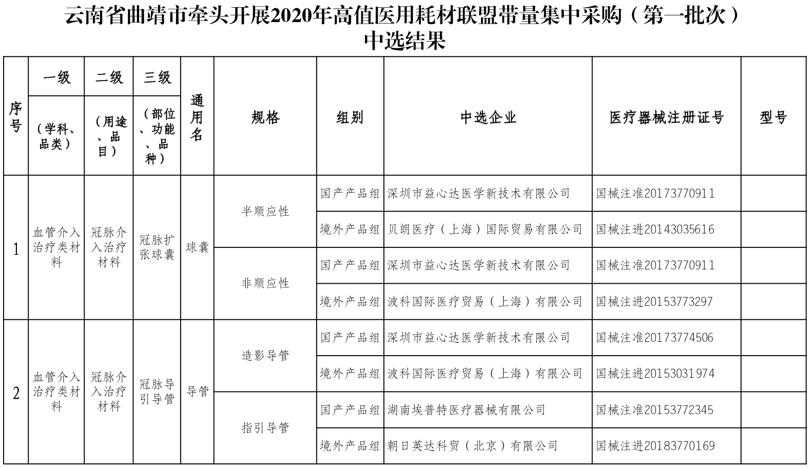 7月13日,云南省曲靖市醫(yī)用耗材聯(lián)合采購辦公室發(fā)布公示,已完成2020年第一批公立醫(yī)療機構(gòu)高值醫(yī)用耗材聯(lián)盟帶量集中采購第一批次現(xiàn)場談判議價。包括冠脈擴張球囊、冠脈導引導管、冠脈導引導絲、雙腔起搏器以及起搏電極導線,現(xiàn)對結(jié)果進行公示。