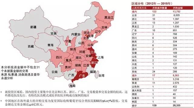 從地域來(lái)看,2012年至2015年,境內(nèi)醫(yī)院并購(gòu)活動(dòng)主要集中在北京、江蘇、浙江和廣東等醫(yī)改先行地區(qū),四地并購(gòu)數(shù)量占總數(shù)的一半以上,投資金額占總額約70%。