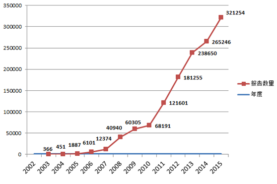 圖1-1 2002-2015年全國可疑醫(yī)療器械不良事件報告數(shù)量
