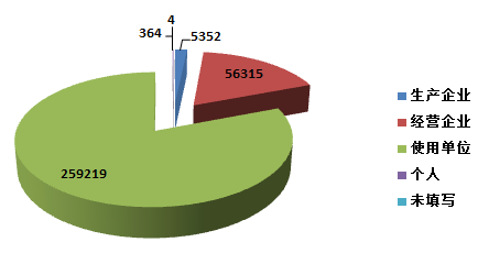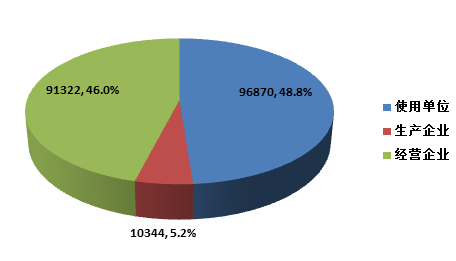 截止2015年12月31日,在全國醫(yī)療器械不良事件監(jiān)測系統(tǒng)中,注冊基層用戶(包括醫(yī)療器械生產(chǎn)企業(yè)、經(jīng)營企業(yè)和使用單位)共198, 536家。其中,醫(yī)療器械生產(chǎn)企業(yè)10,344家,占注冊基層用戶總數(shù)的5.2%;經(jīng)營企業(yè)91,322家,占注冊基層用戶的46.0%;使用單位96,870家,占注冊基層用戶的48.8%(圖1-4)。