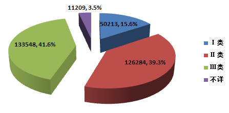 2015年,全國上報的可疑醫(yī)療器械不良事件報告中,涉及Ⅲ類醫(yī)療器械的報告133,548份,占總報告數(shù)的41.6%;涉及Ⅱ類醫(yī)療器械的報告126,284份,占總報告數(shù)的39.3%;涉及Ⅰ類醫(yī)療器械的報告50,213份,占總報告數(shù)的15.6%;部分報告涉及的器械管理類別不詳,共 11,209份,占總報告數(shù)的3.5%。數(shù)據(jù)顯示,涉及Ⅲ類和Ⅱ類醫(yī)療器械的報告占絕大多數(shù),這與醫(yī)療器械風(fēng)險程度高低相吻合(圖2-3)。