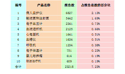 表2-3 報告數(shù)量排名前十位的有源醫(yī)療器械