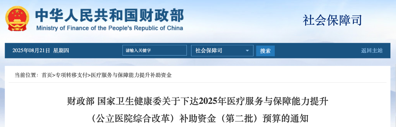 8月20日,財(cái)政部發(fā)布《財(cái)政部國家衛(wèi)生健康委關(guān)于下達(dá)2025年醫(yī)療服務(wù)與保障能力提升(公立醫(yī)院綜合改革)補(bǔ)助資金(第二批)預(yù)算的通知》。