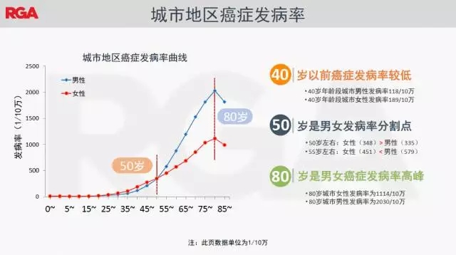 城市女性在20-50歲之間,癌癥發(fā)病率均高于同齡男性;