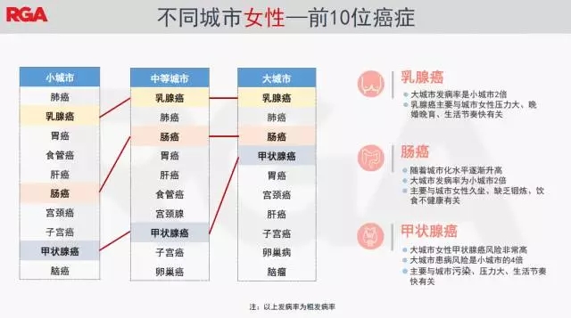 ③ 女性癌癥在大城市最高,男性癌癥在小城市最高;