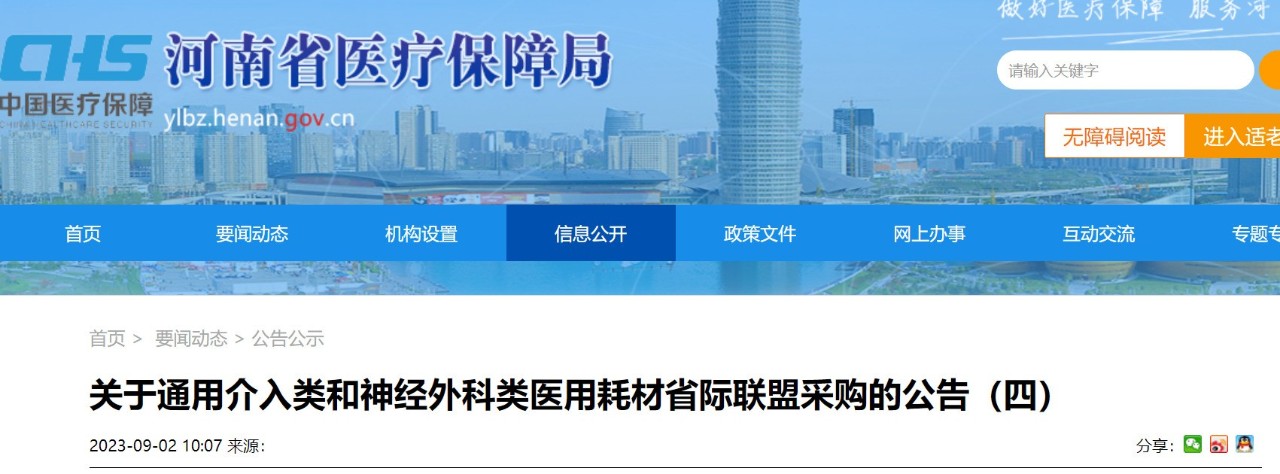 9月2日,河南醫(yī)保局發(fā)布《關(guān)于通用介入類和神經(jīng)外科類醫(yī)用耗材省際聯(lián)盟采購的公告(四)》(簡稱《公告》)。