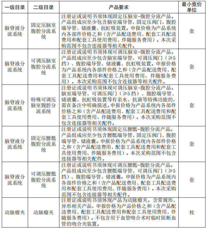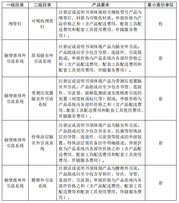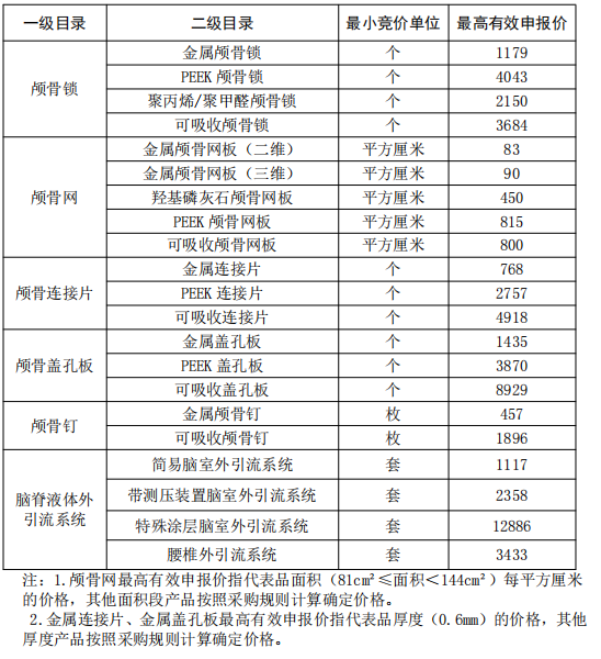 神經(jīng)外科集采品種:顱骨鎖、顱骨網(wǎng)、顱骨連接片、顱骨蓋孔板、顱骨釘、固定壓腦室腹腔分流系統(tǒng)、可調(diào)壓腦室腹腔分流系統(tǒng)、固定壓腰骶腹腔分流系統(tǒng)、可調(diào)壓腰骶腹腔分流系統(tǒng)、簡易腦室外引流系統(tǒng)、帶測壓裝置系統(tǒng)腦室外引流系統(tǒng)、腰椎外引流系統(tǒng)、動脈瘤夾。
