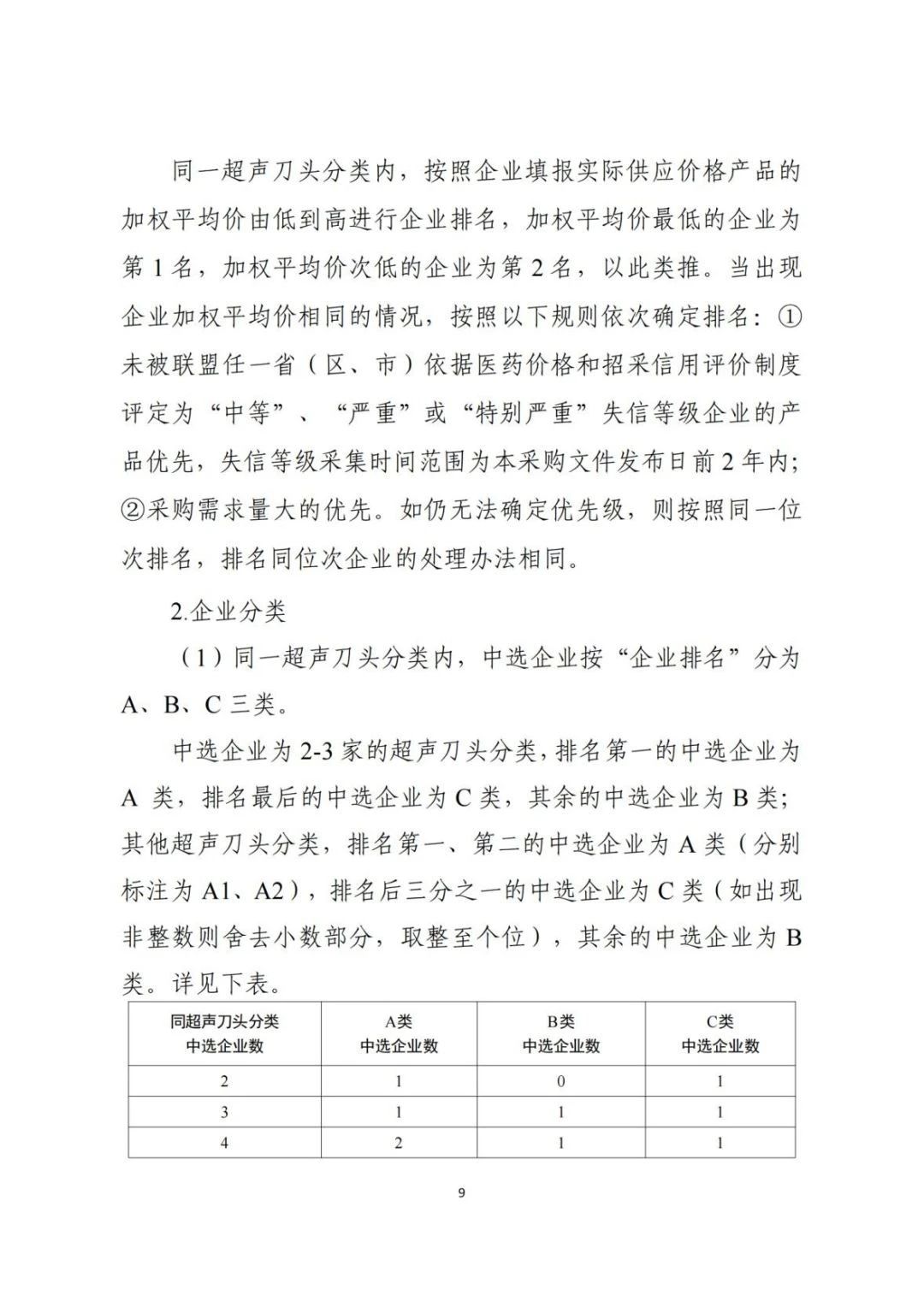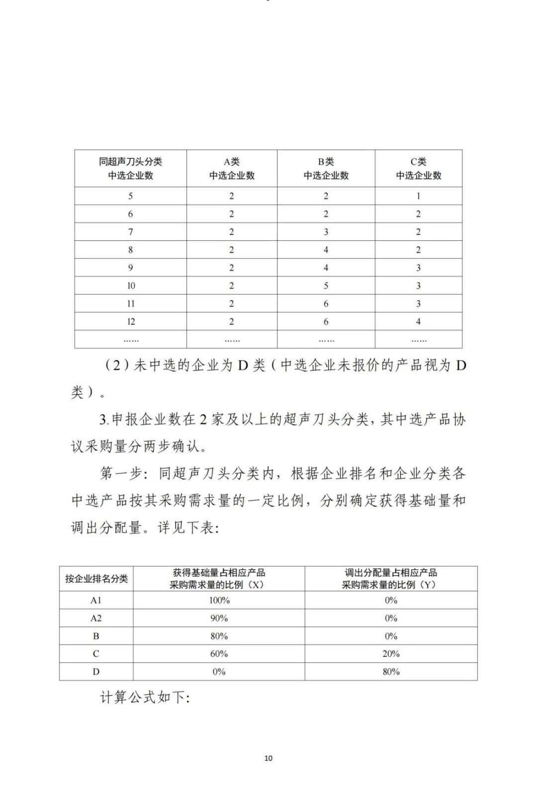 同一超聲刀頭分類(lèi)內(nèi),中選企業(yè)按“企業(yè)排名”分為A、B、C三類(lèi),未中選的企業(yè)為D類(lèi),中選企業(yè)未報(bào)價(jià)的產(chǎn)品也視為D類(lèi),分類(lèi)情況與協(xié)議采購(gòu)量直接掛鉤(具體分配規(guī)則見(jiàn)文末)。
