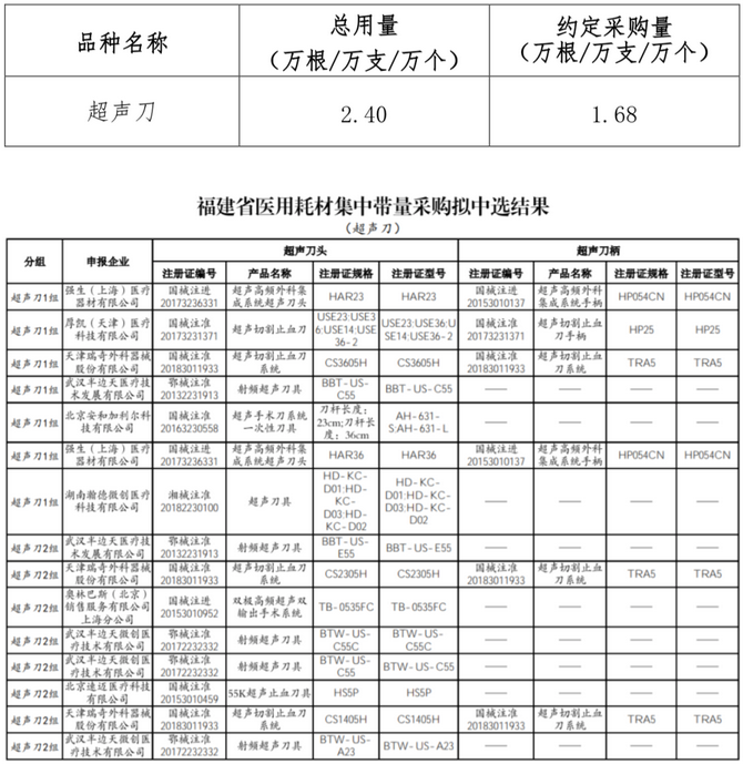 從中選結(jié)果可以看到,超聲刀類耗材擬中選企業(yè)包括強(qiáng)生、奧林巴斯、天津瑞奇、北京速邁以及武漢半邊天等械企。