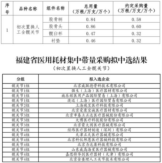 初次置換人工全髖關(guān)節(jié)擬中選企業(yè)包括強(qiáng)生、施樂(lè)輝、捷邁、山東威高等械企;