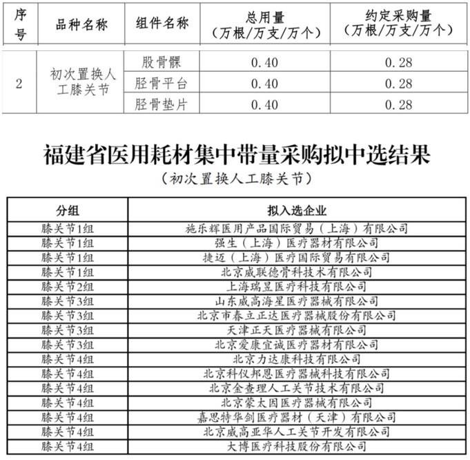 初次置換人工膝關(guān)節(jié)擬中選企業(yè)包括強(qiáng)生、捷邁、施樂(lè)輝、山東威高、大博醫(yī)療等械企;