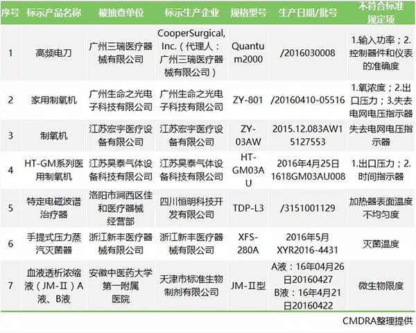 被抽檢項目為標識標簽、說明書等項目不符合標準規(guī)定的醫(yī)療器械產品:涉及7家企業(yè)的4個品種7批(臺)。