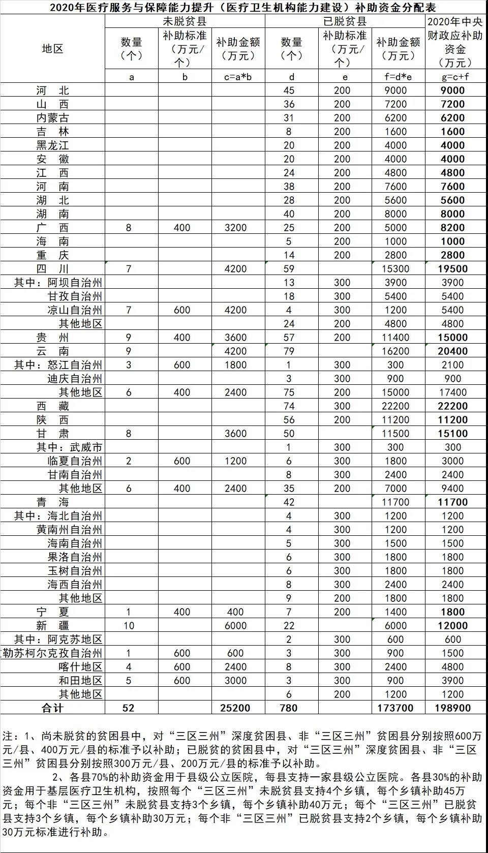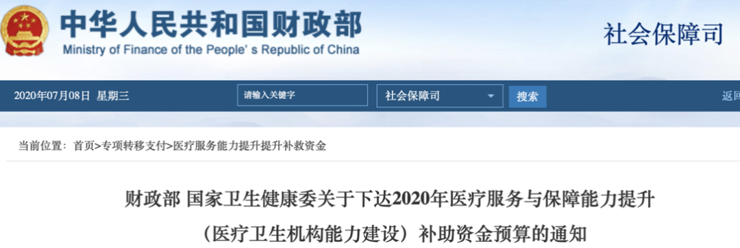 財(cái)政部與國(guó)家衛(wèi)生健康委發(fā)布《關(guān)于下達(dá)2020年醫(yī)療服務(wù)與保障能力提升(醫(yī)療衛(wèi)生機(jī)構(gòu)能力建設(shè))補(bǔ)助資金預(yù)算的通知》,對(duì)各個(gè)省份的資金做了公示。