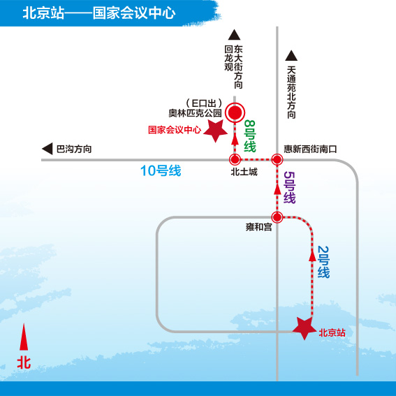 乘地鐵2號線至雍和宮站,站內(nèi)換乘地鐵5號(天通苑北方向),至惠新西街南口站下,換乘地鐵10號線(巴溝方向)至北土城站下,再乘地鐵8號線(回龍觀東大街方向),在奧林匹克公園下車(E口出)。