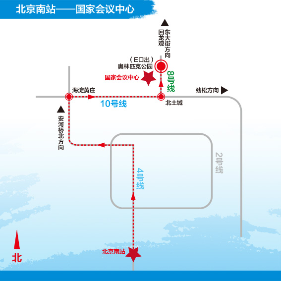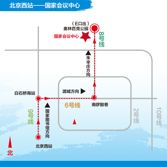 乘坐地鐵9號線(國家圖書館方向)在白石橋南站下車,換乘地鐵6號線(潞城方向)在南鑼鼓巷站下車,再換乘地鐵8號線(朱辛莊方向)在在奧林匹克公園站下車,步行約250米至國家會議中心。