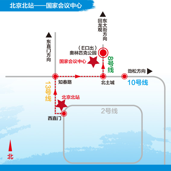 乘地鐵13號線(東直門方向)在知春路站下車,站內(nèi)換乘地鐵10號線(勁松方向),至北土城站下車,再乘地鐵8號線(回龍觀東大街方向),在奧林匹克公園下車(E口出)。