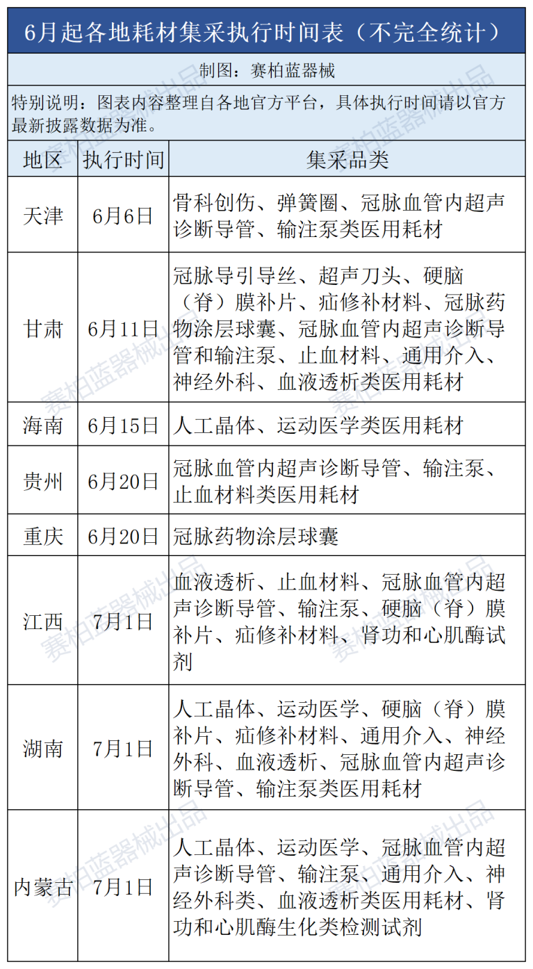 據(jù)觀察,今年5月起,多個(gè)重磅耗材聯(lián)盟集采開(kāi)始進(jìn)入密集執(zhí)行期。賽柏藍(lán)器械梳理6月以來(lái)已經(jīng)和將要落地的耗材集采如下: