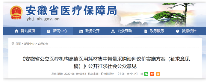 6月19日,安徽省醫(yī)保局發(fā)布《安徽省公立醫(yī)療機(jī)構(gòu)高值醫(yī)用耗材集中帶量采購(gòu)談判議價(jià)實(shí)施方案(征求意見稿)》(下稱《征求意見稿》)。