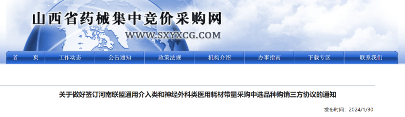 根據(jù)通知, 2024年1月30日起,山西省醫(yī)保平臺開通通用介入類和神經(jīng)外科類醫(yī)用耗材帶量采購三方購銷協(xié)議簽訂系統(tǒng)、冠脈導(dǎo)引導(dǎo)絲(接續(xù))帶量采購三方購銷協(xié)議簽訂系統(tǒng)。