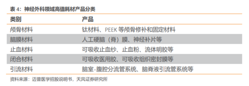 神經(jīng)外科耗材包括顱骨材料、腦膜材料、引流材料、縫合材料、神經(jīng)刺激材料、腦電監(jiān)測材料、輔助工具等,整體技術(shù)門檻較高。