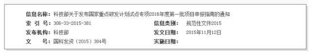 重點(diǎn)專項(xiàng),是國家重點(diǎn)研發(fā)計(jì)劃組織實(shí)施的載體,受到國家的高度重視。按照國發(fā)64號(hào)文件關(guān)于先期啟動(dòng)5-10個(gè)試點(diǎn)專項(xiàng)的要求,科技部、財(cái)政部、發(fā)改委會(huì)同相關(guān)部門凝練形成了“干細(xì)胞及轉(zhuǎn)化研究”、“數(shù)字診療裝備研發(fā)”、“大氣污染成因與控制技術(shù)研究”、“新能源汽車”、“化學(xué)肥料和農(nóng)藥減施增效綜合技術(shù)研發(fā)”、“七大農(nóng)作物育種”6個(gè)試點(diǎn)專項(xiàng)。