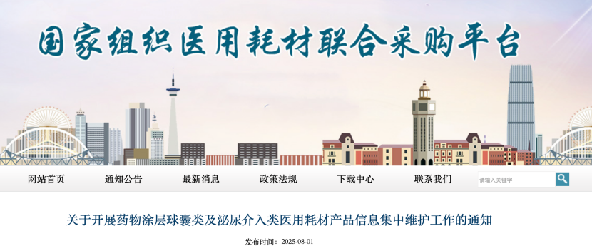 國家組織醫(yī)用耗材聯(lián)合采購平臺(tái)藥物涂層球囊類及泌尿介入類醫(yī)用耗材產(chǎn)品信息集中維護(hù)時(shí)間為2025年8月1日至8月11日12時(shí)。