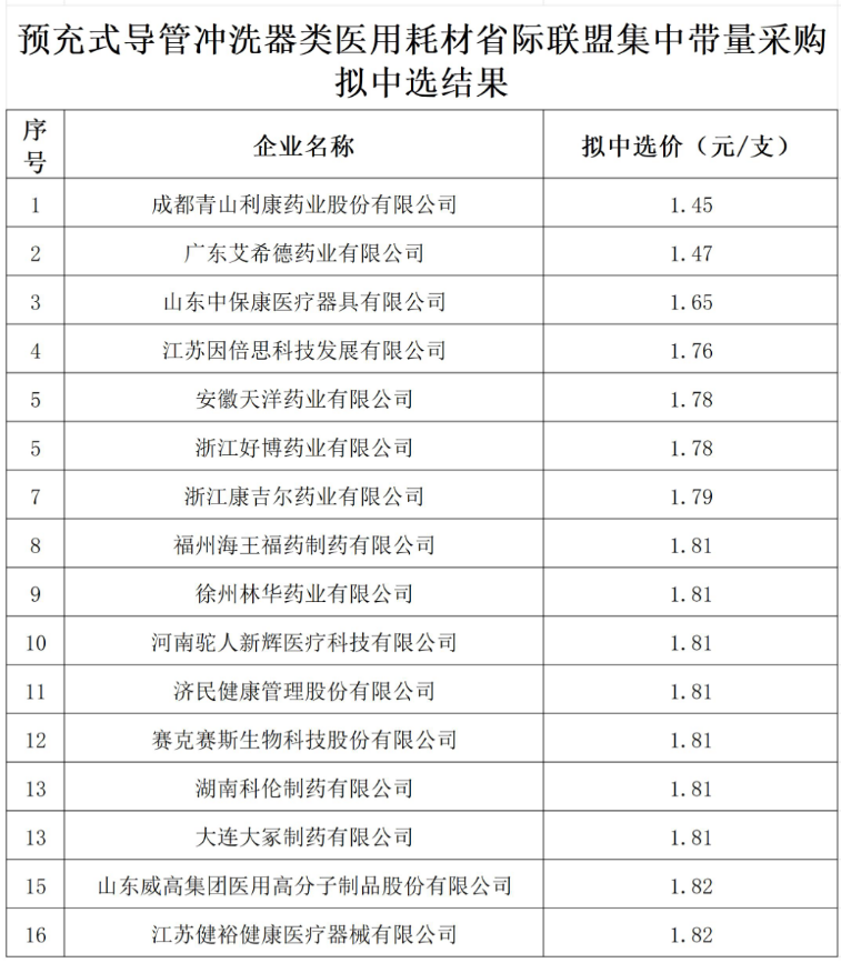 11月21日,內蒙古醫(yī)保局發(fā)布《關于預充式導管沖洗器類醫(yī)用耗材省際聯(lián)盟集中帶量采購擬中選結果的公示》。