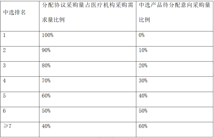醫(yī)院填報了采購需求量但未中選的企業(yè)產品采購需求量、中選產品待分配意向采購量及申報價格高于醫(yī)療機構現行實際采購價格的企業(yè)需求量合并為醫(yī)療機構的待分配總量,醫(yī)療機構的待分配總量可自主分配給中選產品中價格適宜的產品,但分配給第1名的待分配總量不得小于中選企業(yè)平均分配比例,即:如5家企業(yè)中選,則第1名得到待分配總量的比例不得小于20%,申報價格高于醫(yī)療機構現行實際采購價格的企業(yè)除外。