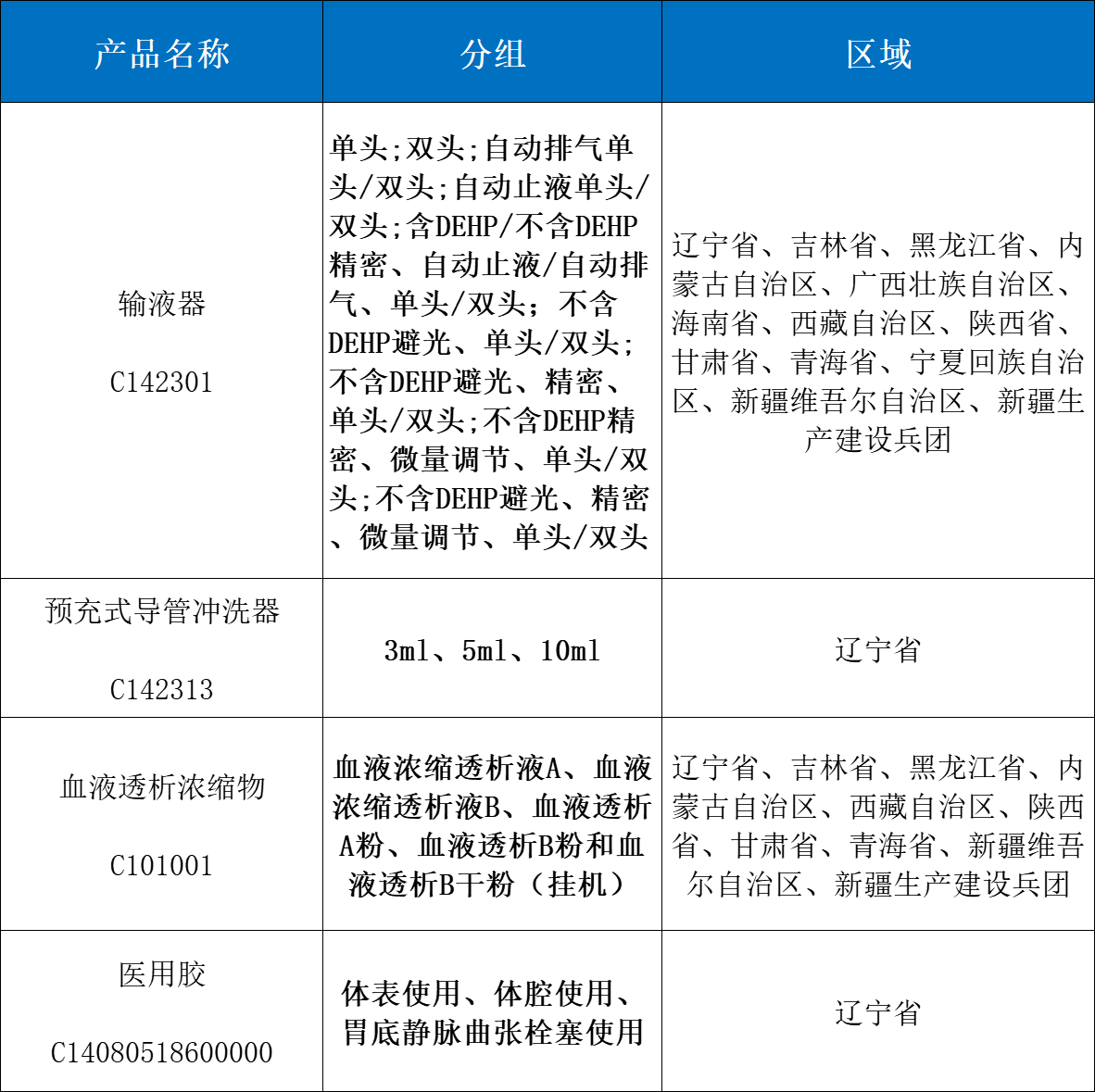 此次價格聯(lián)動采購品種為輸液器、預(yù)充式導(dǎo)管沖洗器、血液透析濃縮物、醫(yī)用膠,品種分組、聯(lián)動地區(qū)如下: