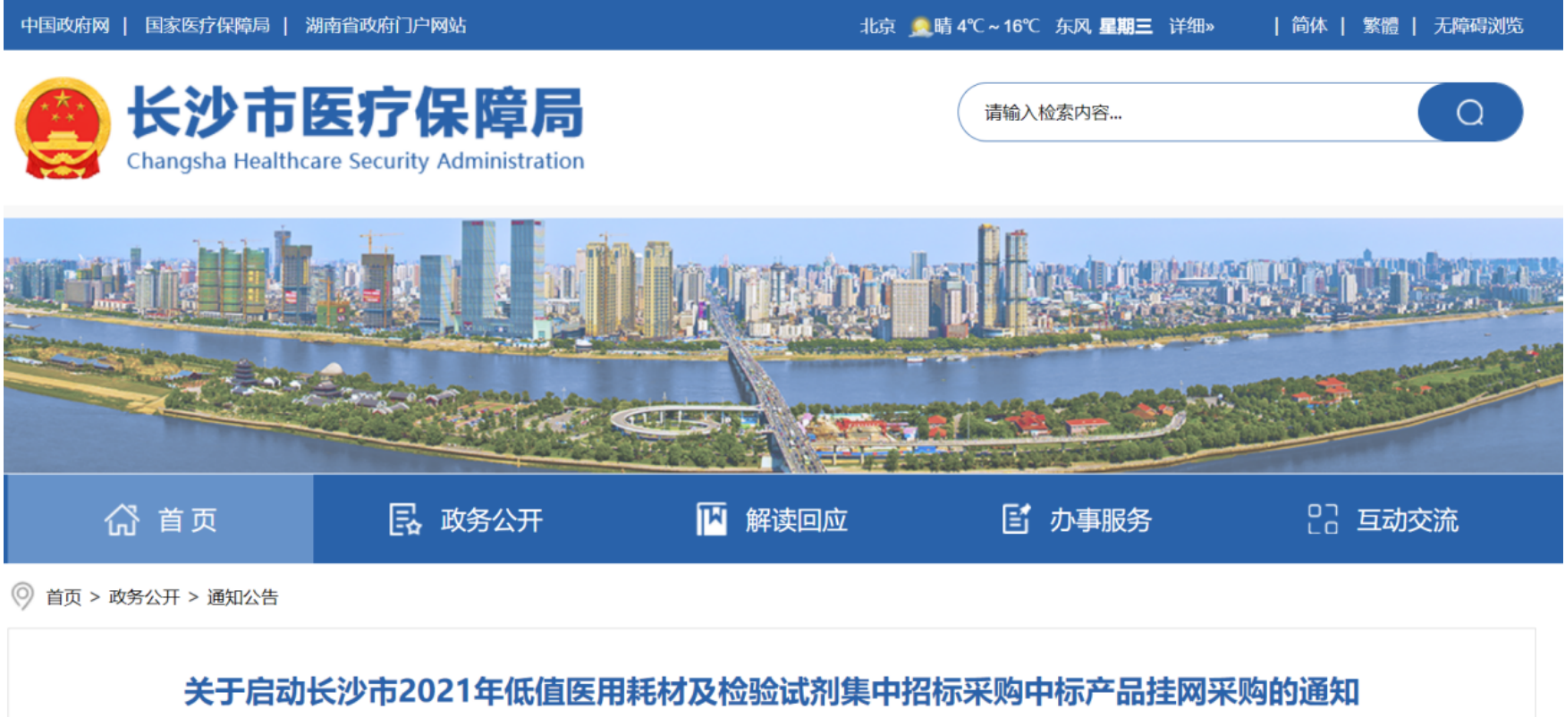 據(jù)長沙市醫(yī)保局消息,自11月1日起,該市2021 年低值醫(yī)用耗材及檢驗(yàn)試劑集中招標(biāo)采購中標(biāo)結(jié)果正式掛網(wǎng)執(zhí)行。