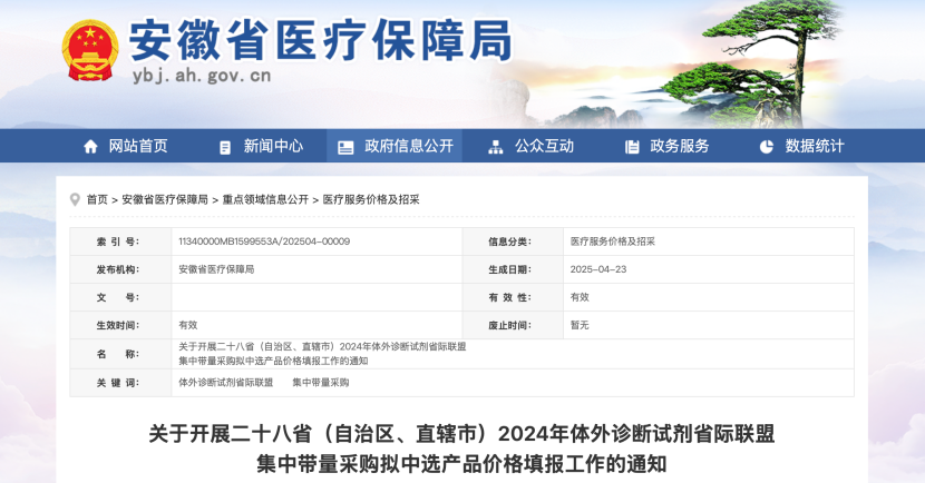 4月23日,安徽醫(yī)保局發(fā)布《關于開展二十八省(自治區(qū)、直轄市)2024年體外診斷試劑省際聯(lián)盟集中帶量采購擬中選產品價格填報工作的通知》,對擬中選產品的全國省級掛網(wǎng)最低價等價格開展填報工作。