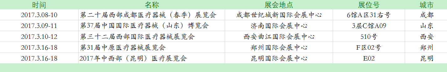 日前,為期半個(gè)月的五個(gè)展會(huì)相繼圓滿(mǎn)結(jié)束 !! 分別是“第二十屆西部成都醫(yī)療器械(春季)展覽會(huì)”、“第37屆中國(guó)國(guó)際醫(yī)療器械(山東)博覽會(huì)”、“第三十二屆西部國(guó)際醫(yī)療器械展覽會(huì)”、“第31屆中原醫(yī)療器械展覽會(huì)”、以及“2017年中西部(昆明)醫(yī)療展覽會(huì)” 。詳細(xì)時(shí)間地點(diǎn)見(jiàn)下表