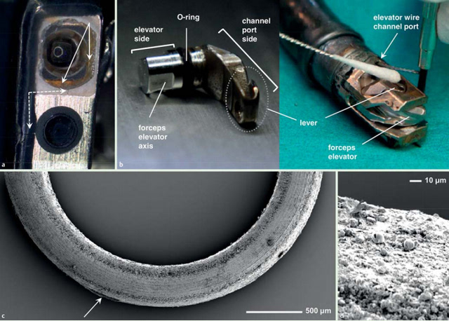 一組感染內(nèi)鏡部分拆卸零件的電子顯微照片顯示,內(nèi)鏡鏡蓋靠近物鏡部分有裂痕,幾個內(nèi)鏡部件表面可見棕色染色的污垢