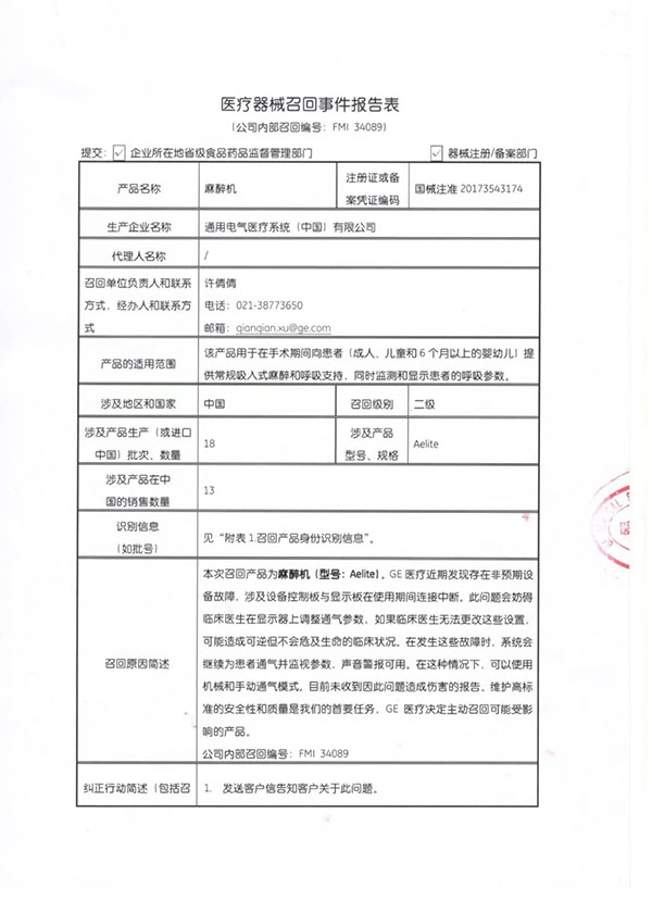 通用電氣醫(yī)療系統(tǒng)(中國)有限公司對麻醉機主動召回