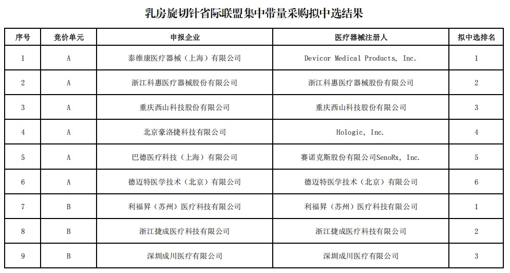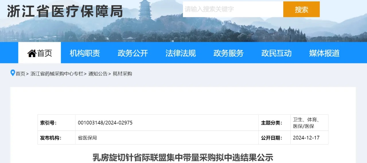 12月17日,浙江醫(yī)保局發(fā)布《乳房旋切針省際聯(lián)盟集中帶量采購擬中選結(jié)果公示》。