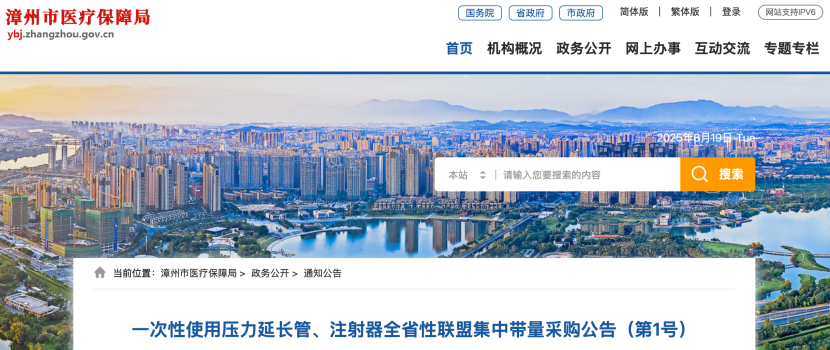 8月18日-8月19日,福建漳州、廈門醫(yī)保局分別發(fā)布《一次性使用壓力延長管、注射器全省性聯(lián)盟集中帶量采購公告(第1號)》《一次性使用有創(chuàng)血壓傳感器、一次性使用宮頸擴張球囊全省性聯(lián)盟集中帶量采購公告(第1號)》。