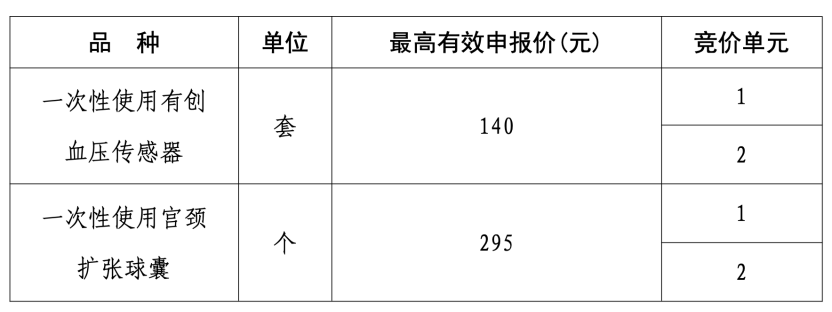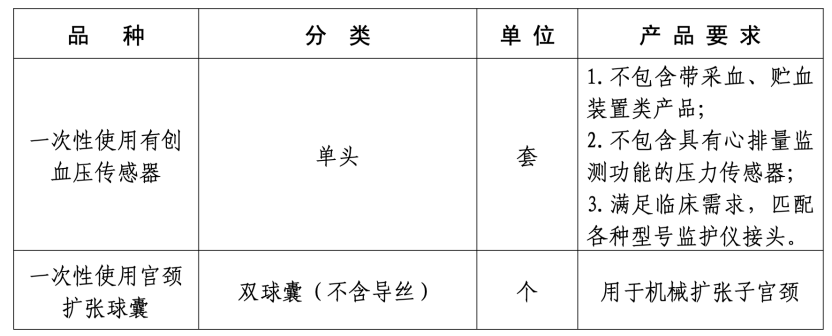 其中,一次性使用有創(chuàng)血壓傳感器、一次性使用宮頸擴張球囊產品要求及最高有效申報價如下: