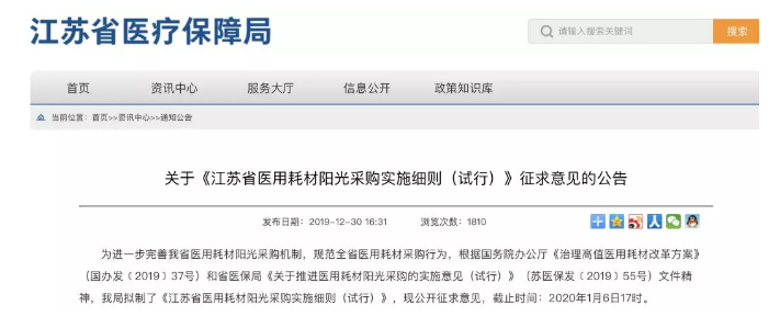 12月30日,江蘇省醫(yī)療保障局印發(fā)關(guān)于征求《江蘇省醫(yī)用耗材陽光采購實施細則(試行)》意見的通知,此規(guī)定根據(jù)國務(wù)院辦公廳《治理高值醫(yī)用耗材改革方案》和《關(guān)于推進醫(yī)用耗材陽光采購的實施意見(試行)》文件精神制定。
